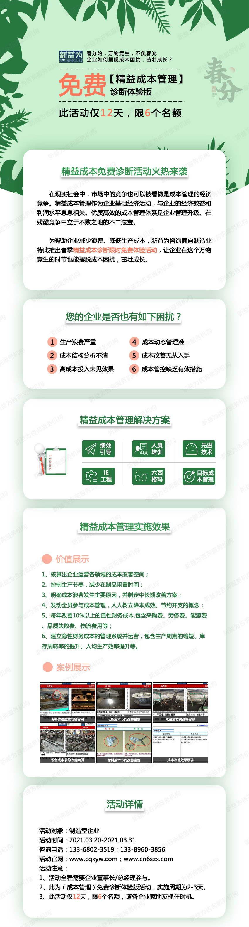 在現(xiàn)實社會中,市場中的競爭也可以被看做是成本管理的經(jīng)濟競爭。精益成本管理作為企業(yè)基礎經(jīng)濟活動,與企業(yè)的經(jīng)濟效益和利潤水平息息相關(guān)。優(yōu)質(zhì)高效的成本管理體系是企業(yè)管理升級、在殘酷競爭中立于不敗之地的不二法寶。 為幫助企業(yè)減少浪費、降低生產(chǎn)成本,新益為咨詢面向制造業(yè)特此推出春季精益成本診斷限時免費體驗活動,讓企業(yè)在這個萬物競生的時節(jié)也能擺脫成本困擾,茁壯成長。